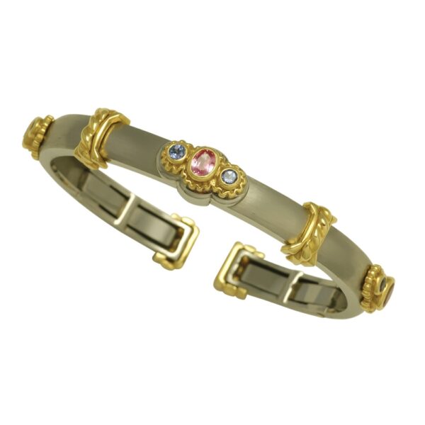 Callista Pink Sapphire and Tanzanite Bangle Bracelet, Handmade in 18k Yellow Gold and Stainless Steel with 3 Bezel Set Oval Pink Sapphires Weighing 1.10 Carats Total and 6 Bezel Set Round Tanzanites Weighing .68 Carats Total
