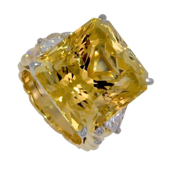 Golden Beryl and Diamond Ring, Handmade in 18k Yellow Gold with a Square Cut Golden Beryl Weighing 27.84 Carats and 2 Pear Shape Diamonds Weighing .70 Carats Total and 20 Round Diamonds Weighing .20 Carats Total